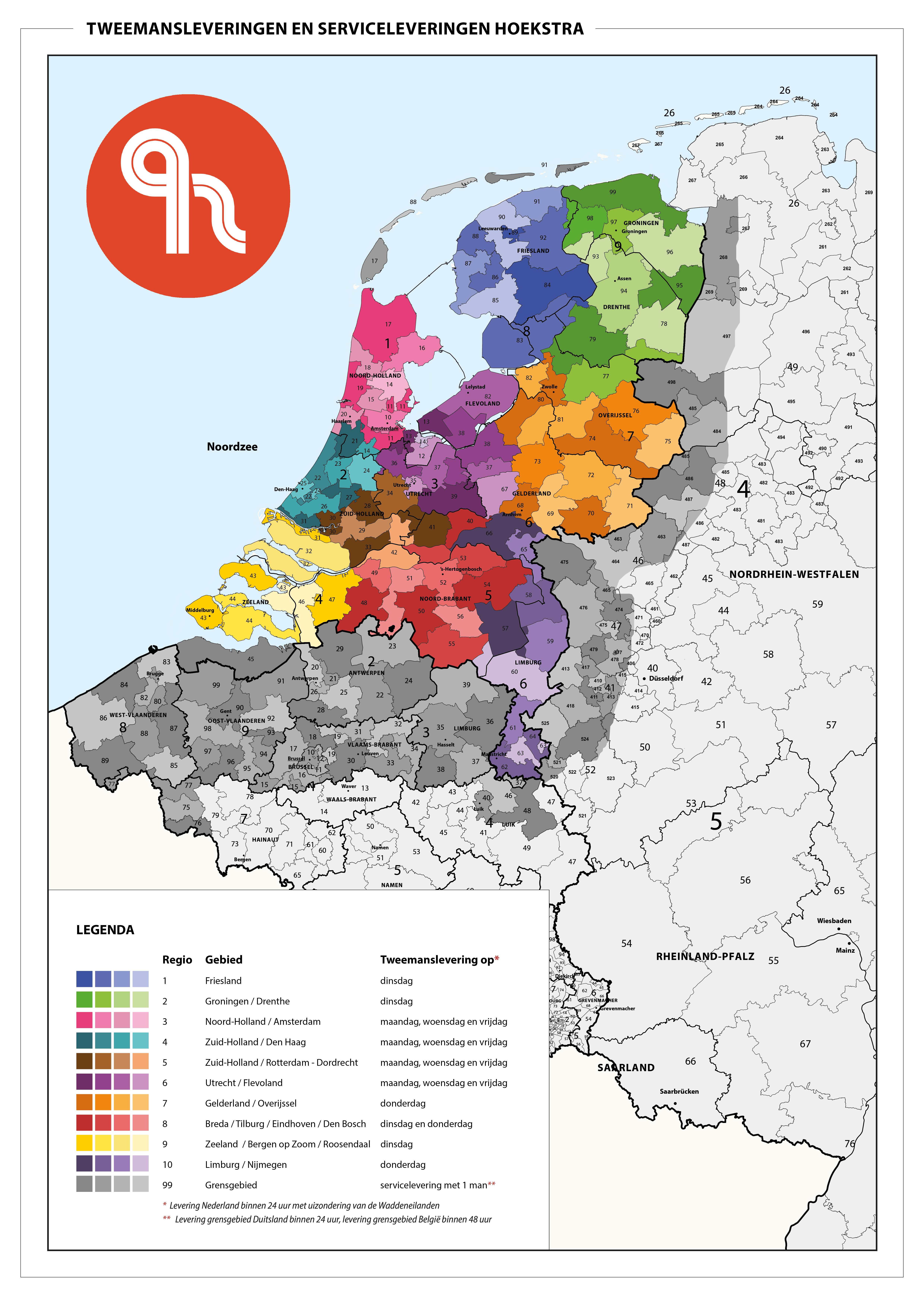 Uw klanten willen de door hen bestelde goederen graag zo snel mogelijk ontvangen. Binnen een groot deel van Nederland komen we daarom 3 keer per week met onze tweemansleveringen. U kunt deze uiteraard ook geautomatiseerd aanleveren. Op bijgaand kaartje ziet u wanneer we waar zijn.